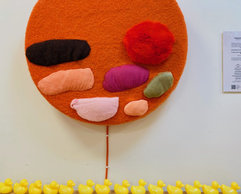 The circular textile piece represents the unbroken cycle of carer and baby when feeding, the safe space for holding and nurturing. It is made from a pre loved orange wool blanket, orange is the colour for communication and hunger. The different fabric pads show the changes to the colour and textures of the skin after giving birth, (contrasting with the softness of baby’s skin), the pads are stuffed with New Romney wool, (New Romney Family Hub was a consultation and touring destination).