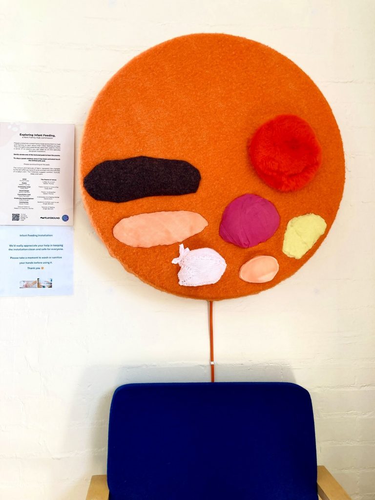 I led a team of Playground Artists working with families in Kent Family Hubs. From consultation sessions with carer’s on their infant feeding experiences I created a textile artwork. The work contains an interactive element, six poems written by poet and Playground Artist Natalie Thomas, it is activated by gently stroking the fabric pads to hear the individual poems.